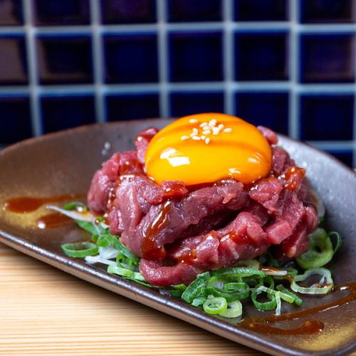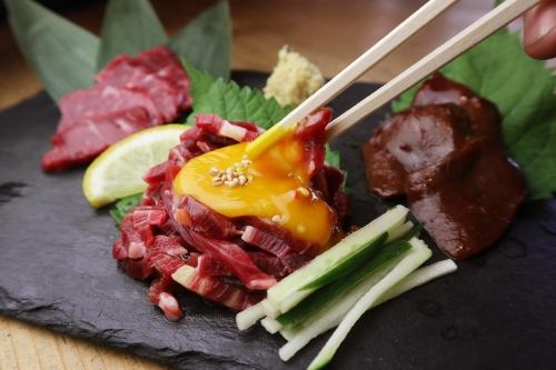 新鮮な馬刺し、白ごま、大葉、そしてユッケのタレをかけた常連様に大人気のメニューです。新鮮な馬肉だからこそできる馬肉ユッケをぜひ味わってみてください。